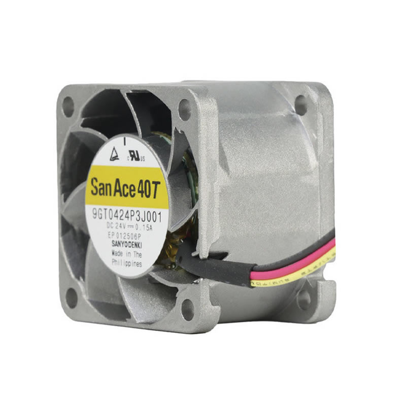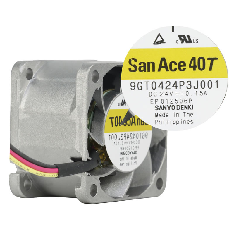 The Sanyo Denki 9GT0424P3J001 is a high-performance 24VDC wide temperature range axial fan with dimensions of 40 x 40 x 28 mm, specifically engineered for extreme environmental thermal management in industrial and outdoor applications. As part of the San Ace 40T series, this cooling solution features a robust aluminum frame and a specialized high-efficiency impeller (UL 94V-0), optimized for superior aerodynamic throughput and stable operation across a vast temperature spectrum. It operates at a rated speed of 11,700 min⁻¹, delivering a maximum air flow of 18.4 CFM (31.2 m³/h) and a static pressure of 0.827 inH₂O (206 Pa). Equipped with a precision dual ball bearing system and PWM control functionality, the 9GT0424P3J001 ensures an exceptional service life of 40,000 hours even at extreme temperatures of 85 °C. This model is characterized by its superior thermal resilience and integrated speed monitoring, making it a critical component for 5G base stations, solar inverters, and high-density power modules.